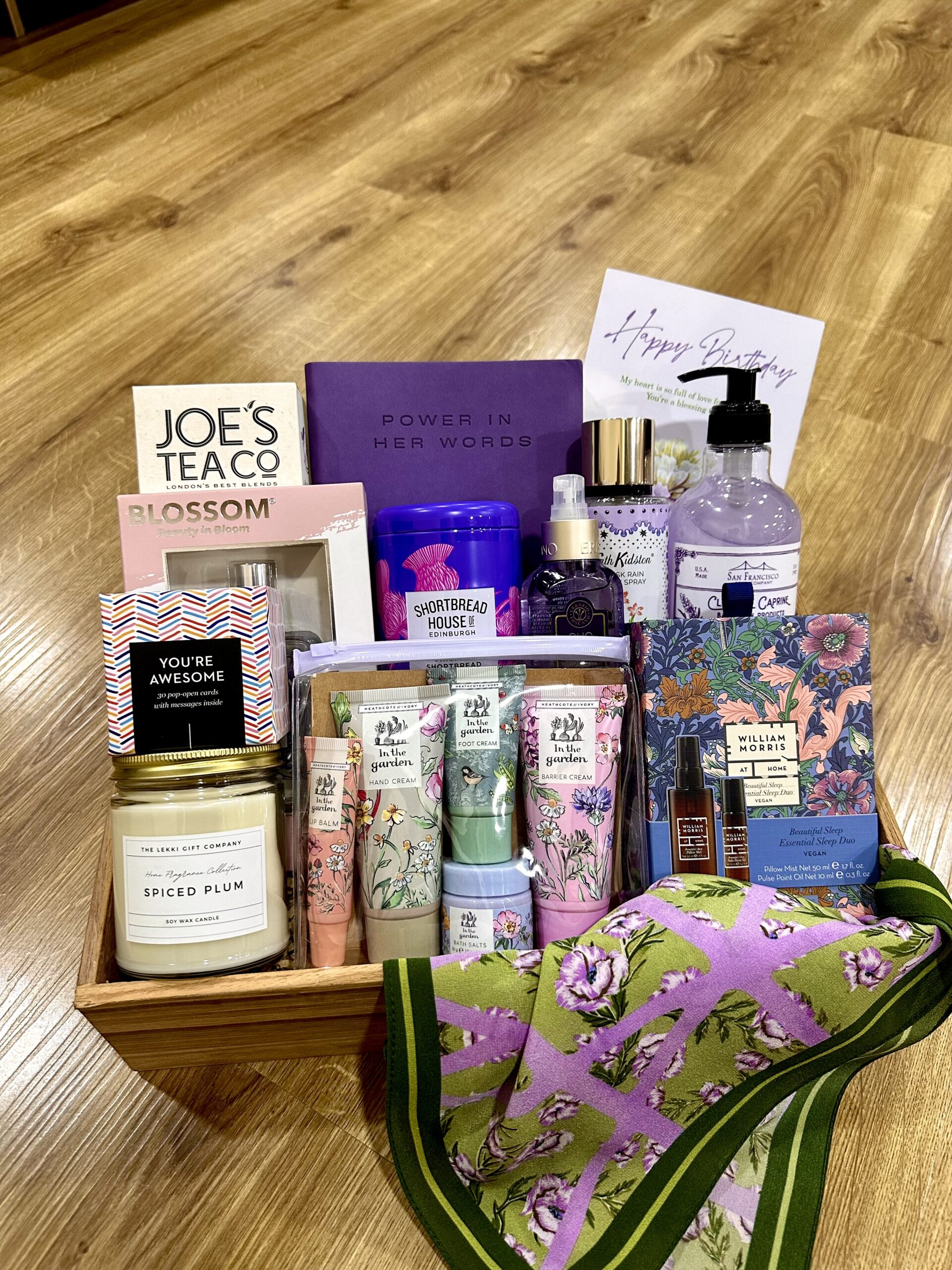 - Silk scarf, sleep duo, thoughtful notes, and birthday card in a signature wooden gift box